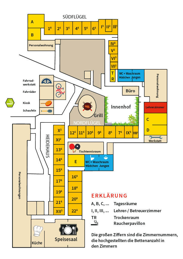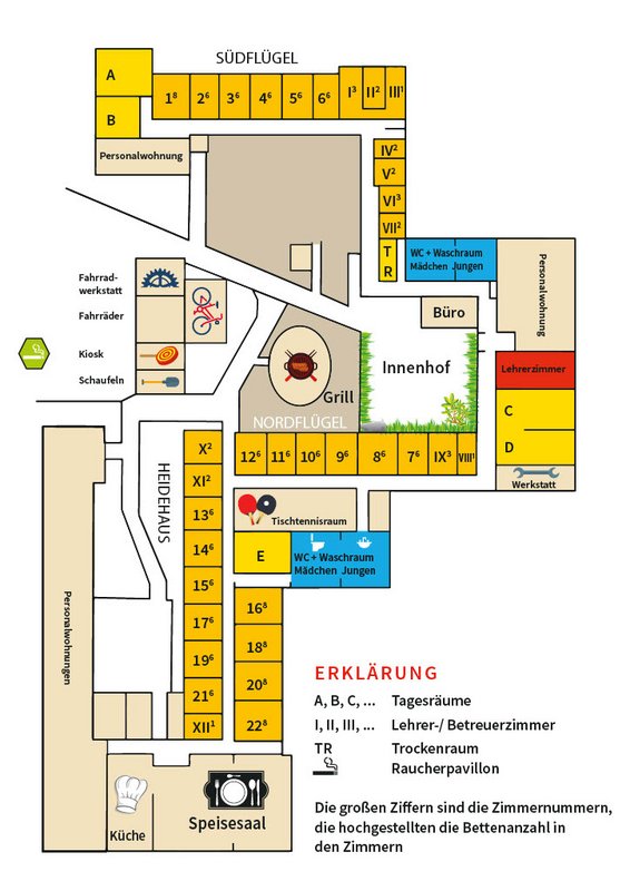Das Gebäude ist durchgehend eingeschossig und gliedert sich in drei Trakte: den Südflügel, den Nordflügel und das Heidehaus. Diese Trakte sind mit einem durchgehenden Gang verbunden, an dessen Ende sich der Küchenbereich mit dem Speisesaal anschließt. In den einzelnen Trakten befinden sich neben den Zimmern für die Teilnehmenden ebenfalls die Betreuerzimmer und die Wasch- und Toilettenräume.