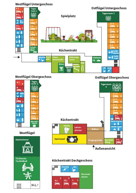 Im 3. Stock des Westflügels befinden sich noch zwei Räume: ein Indoorspielraum und das Kaminzimmer, das auch für Veranstaltungen wie Bunte Abende, Theatervorführungen oder als Probenraum für Chöre genutzt werden kann.