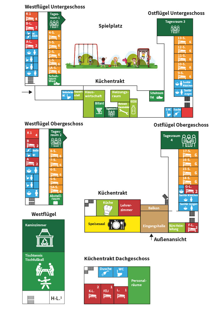 Das Waldschulheim Glücksburg ist unterteilt in drei Bereiche: den Ost- und Westflügel sowie den Mittelteil. Im Mittelteil befindeen sich die Eingangshalle, der Speisesaal, das Lehrerzimmer und das Büro der Heimleitung. Der Ostflügel hat zwei Stockwerke mit jeweils einem Flur. In ihnen liegen die Schlafräume, die sanitären Anlagen für die Schüler*innen und je ein Tagesraum. Die Zimmer für die Begleitung mit Dusche/WC liegen in unmittelbarer Nähe. Der Westflügel hat drei Stockwerke mit zwei Fluren und dem Dachgeschoss. In beiden Fluren befinden sich Schlafräume, sanitäre Anlagen und je zwei Zimmer für die Begleitung und einen Tagesraum. Die Schlafräume sind aufgeteilt in 2 Vierbett- und 19 Sechsbettzimmer.